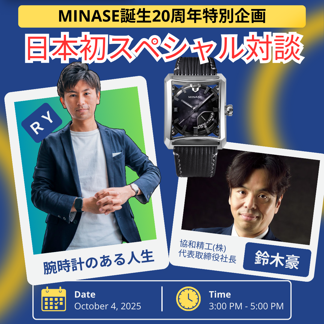 10月4日(土)には特別企画をご用意。なんとMINASEの母体である協和精工株式会社の鈴木豪社長がご登壇くだいます。大人気腕時計YouTuber RYさんとの日本初の対談型トークショー・・・めちゃくちゃ貴重で特別な熱い時間になること間違いなしです!!