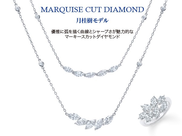 優雅な曲線とシャープさを兼ね備えたマーキースカット。繊細な輝きが連なるデザインは、ネックレスやリングとして上品な存在感を演出します。