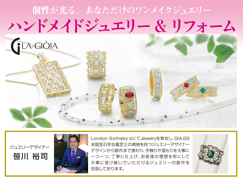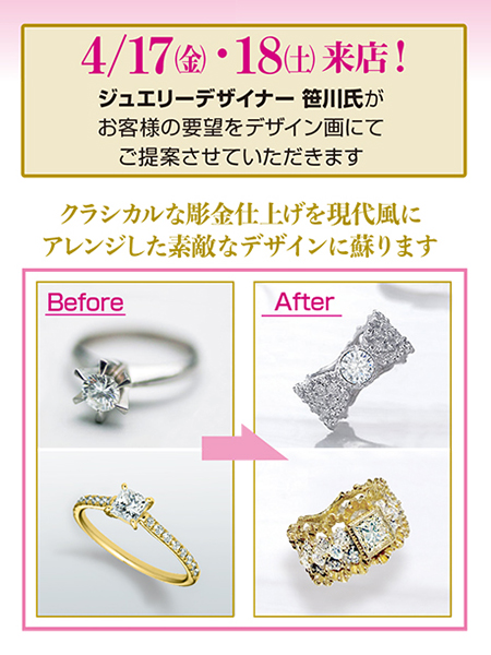 ジュエリーリフォーム・リメイクでは、デザイナーの笹川裕司先生をお招きし、特別相談会を開催いたします。