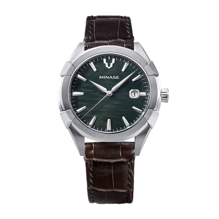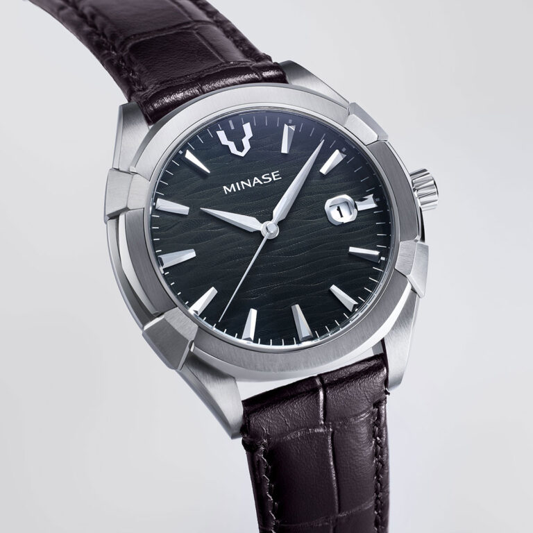 皆瀬川を静かに流れる水流から着想を得たダイアルの模様は、横方向に美しいグラデーションを描き、エレガントながらも落ち着いた 大人の品格が現れています。