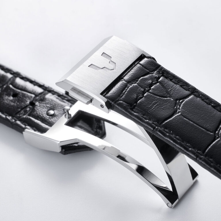 細やかなカットが輝きを放つベゼルの4つのパーツはジュエリーの石留めをイメージ、縦方向に緩やかなカーブを描いたガラスと共にモダンで洗練された印象を与えます。