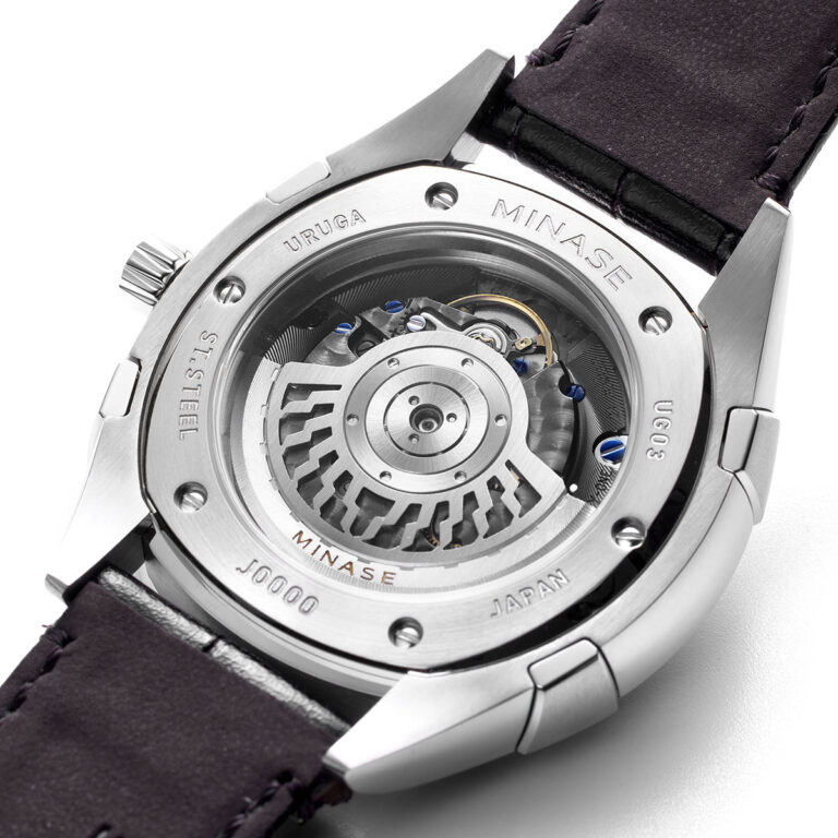 URUGAのコレクション名は、日本語の麗しいという言葉をもとにしています。日本人が麗しいから連想するのは、上品、高貴さ、精神的な気高さ。この日本固有の美を表現するためにMINASEは、時計全体を麗しい宝石に見立て、ベゼル、ガラス、ケースを上下から4つの爪で挟み込んだ 世界に類を見ないクランピング構造を備えたURUGAのコレクションを誕生させました。