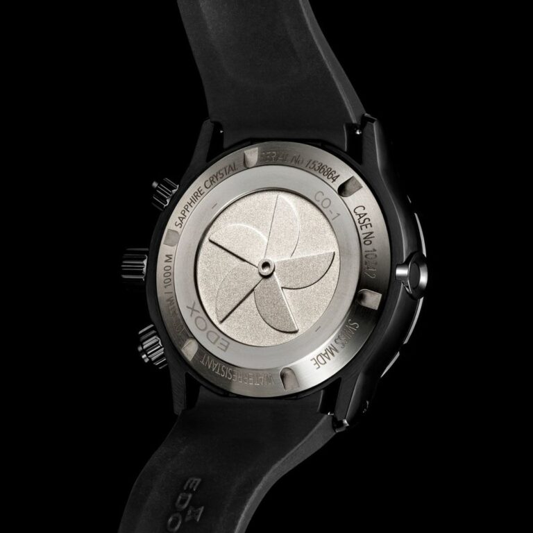 腕に沿うように設計されたラグ、エッジの効いたシャープなフォルム、ラグジュアリースポーツウォッチと呼ぶにふさわしい装飾が施されています。また、ケースバックには、パワーボートで最も重要なパーツのひとつ、プロペラを刻印。腕との密着を防ぐことで装着感を向上させています。